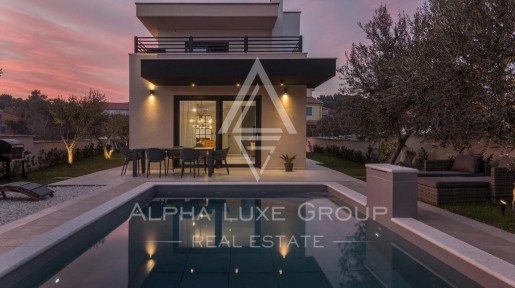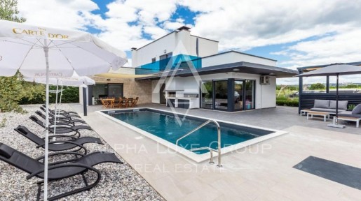 Prodaje se moderna vila s bazenom ukupne površine 241 m2 smještena na tri etaže i 825 m2 uređene okućnice na mirnoj lokaciji. U suterenu nalazi se uređena konoba s kuhinjom i kaminom te još tri prost...
